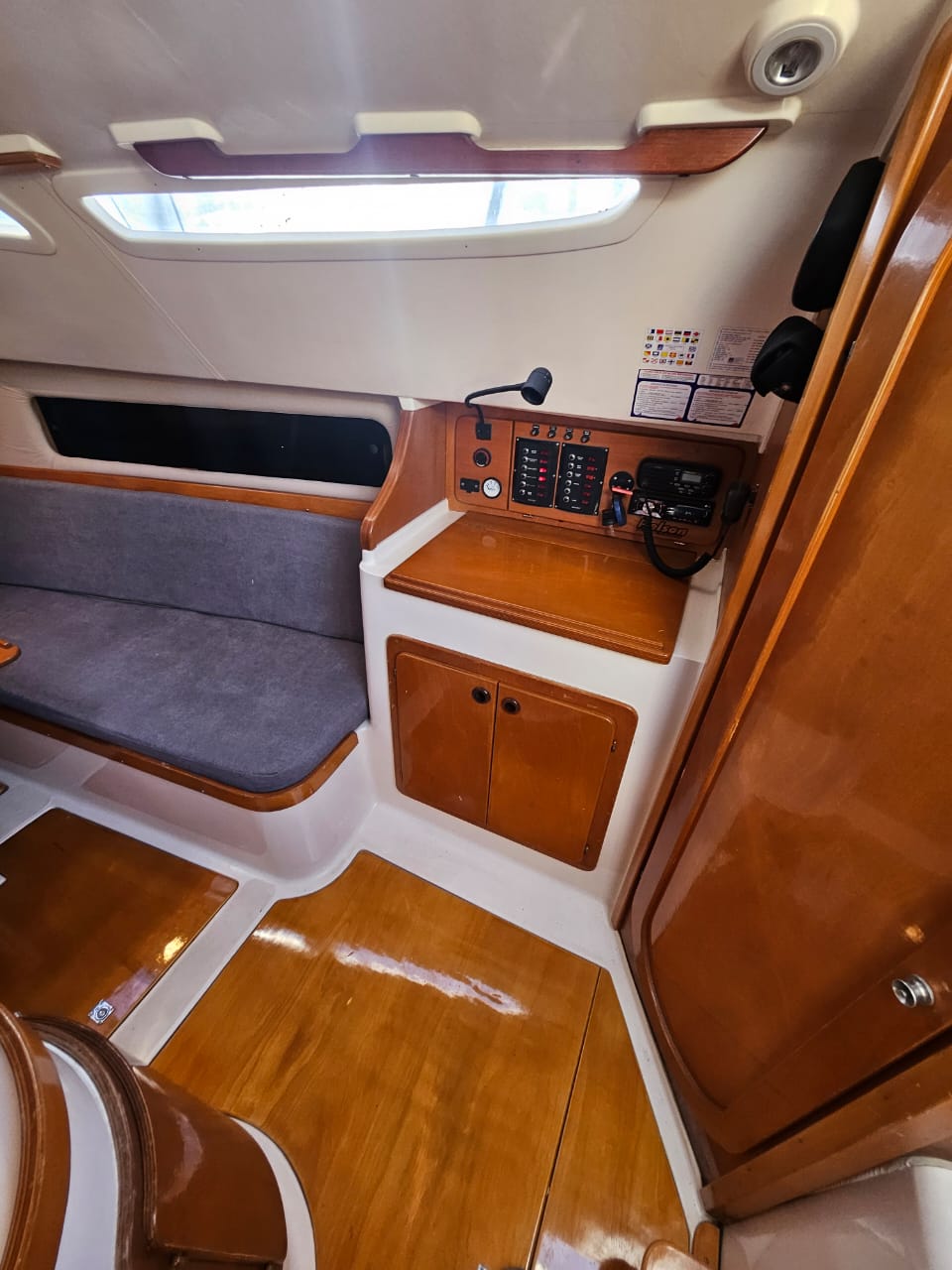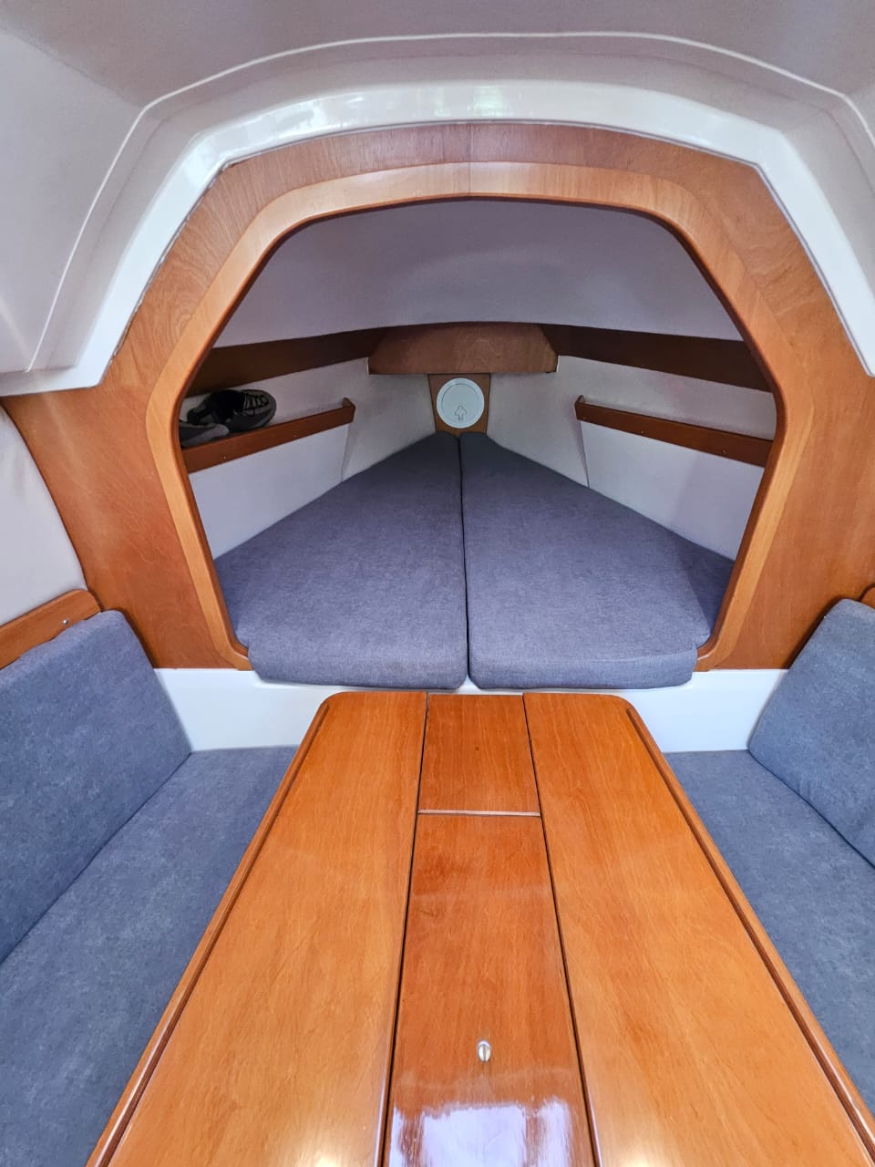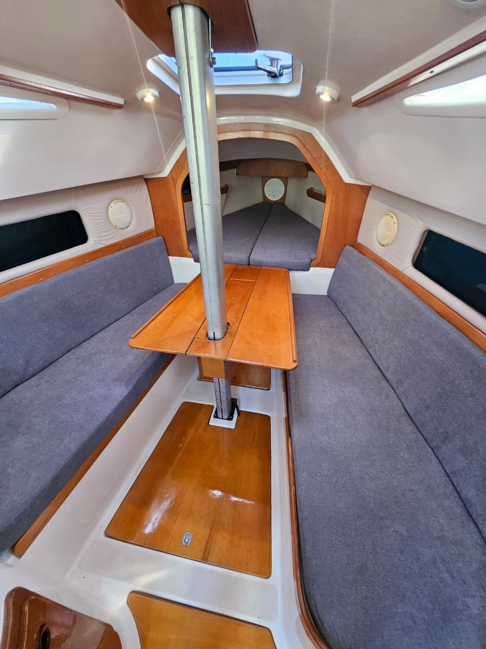 Cama de proa doble, salon con mesa central, mesa de navegacion, sector cocina, conejera, baÑo compartimentado
