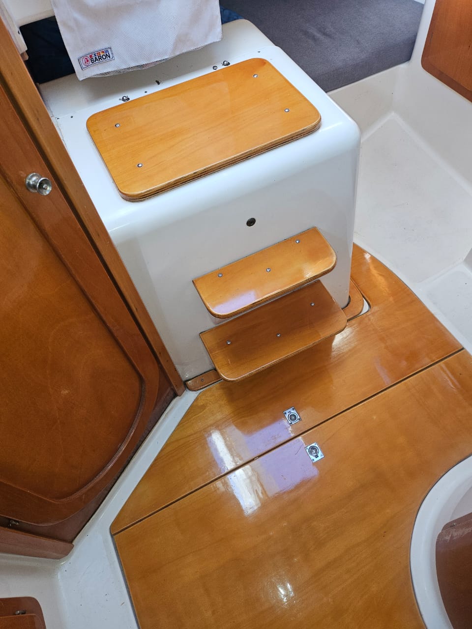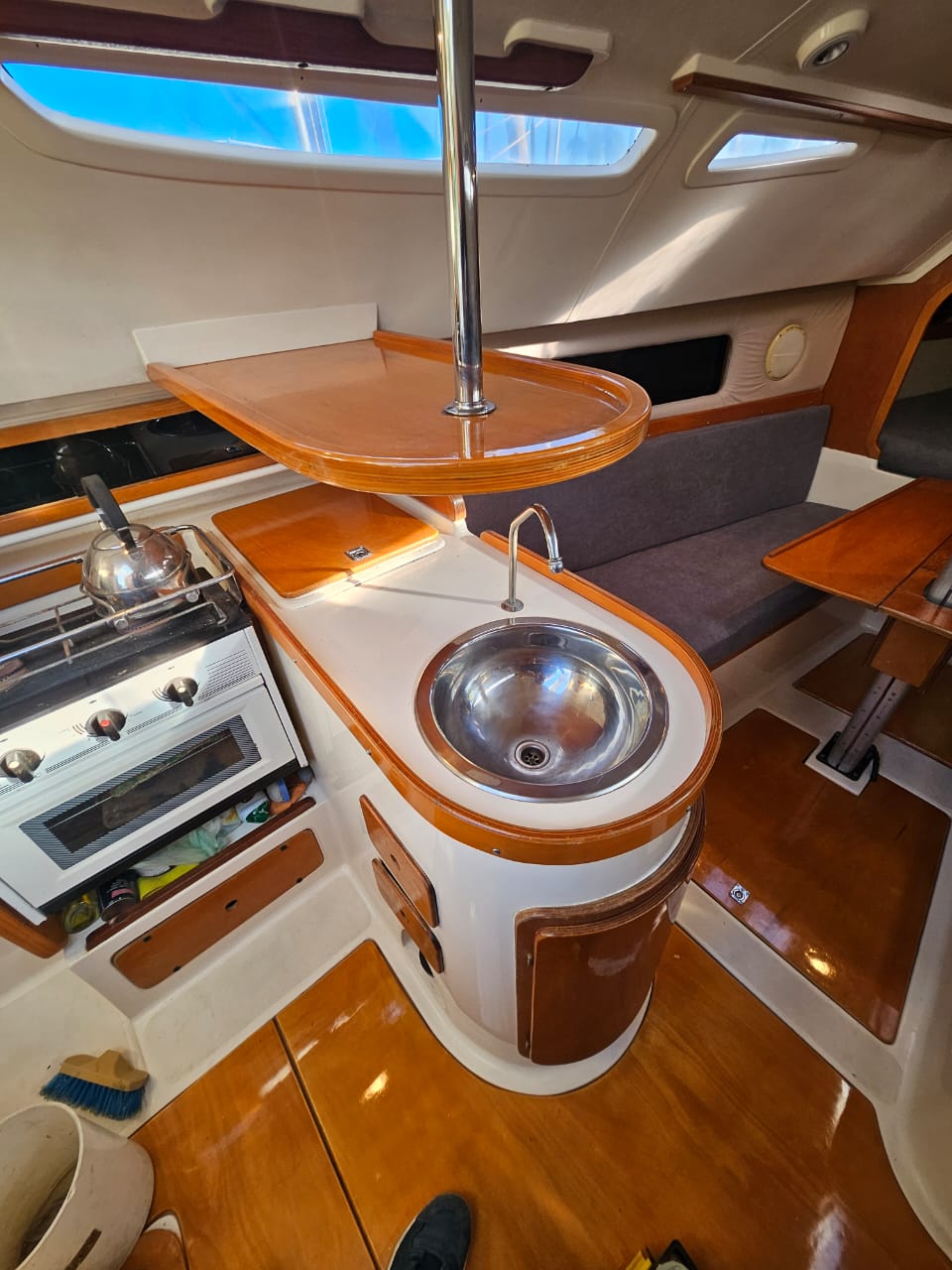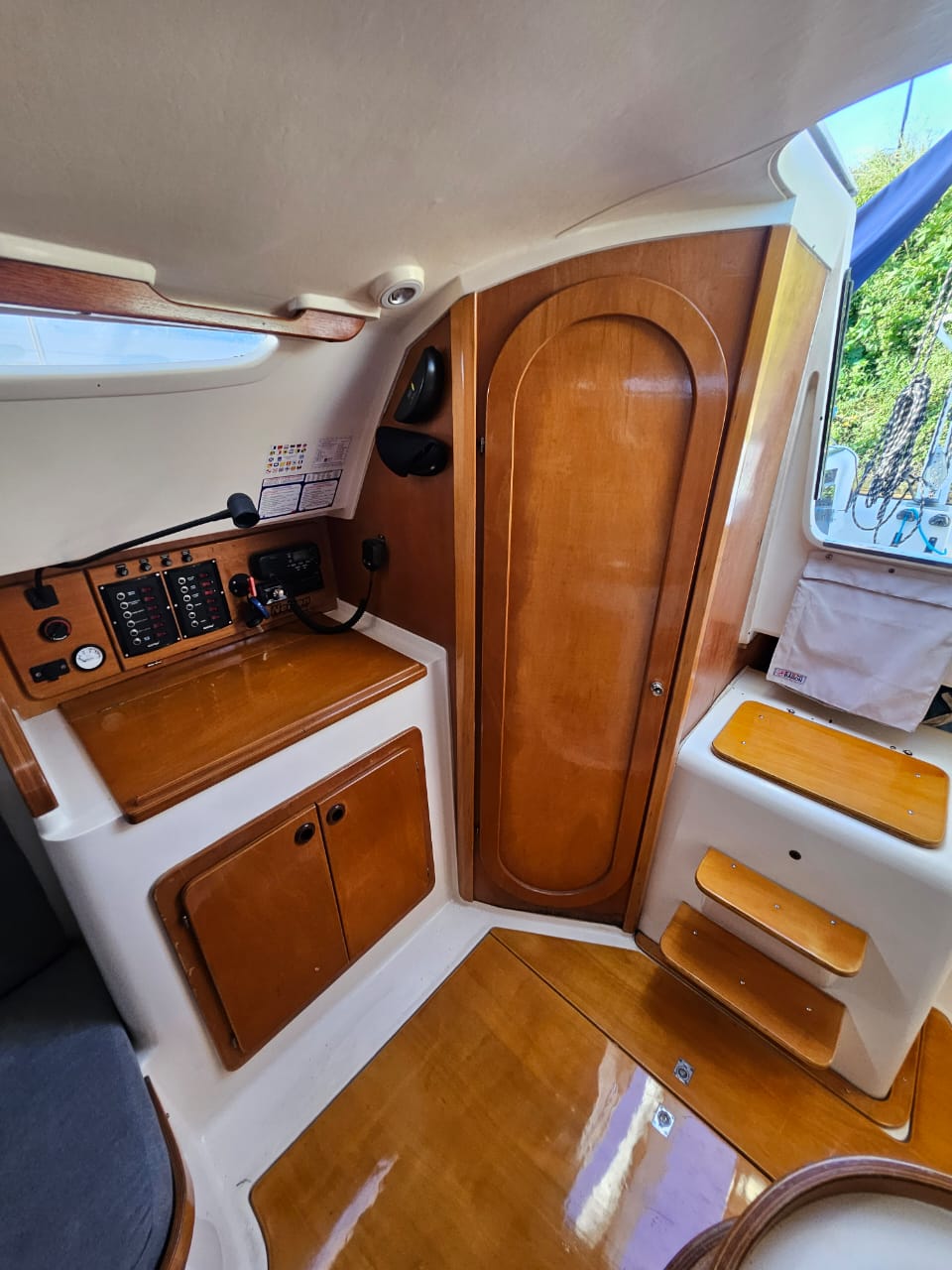 Cama de proa doble, salon con mesa central, mesa de navegacion, sector cocina, conejera, baÑo compartimentado