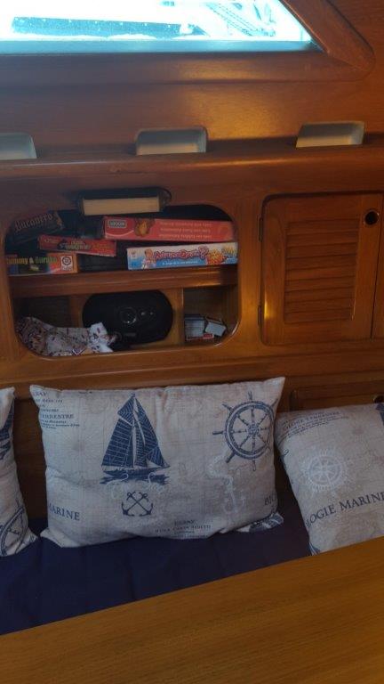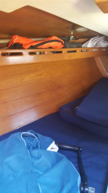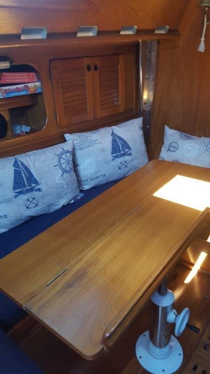 Camarote de proa doble, baño compartimentado, salón con mesa dinette y dos cuchetas, sector cocina, conejera amplia.