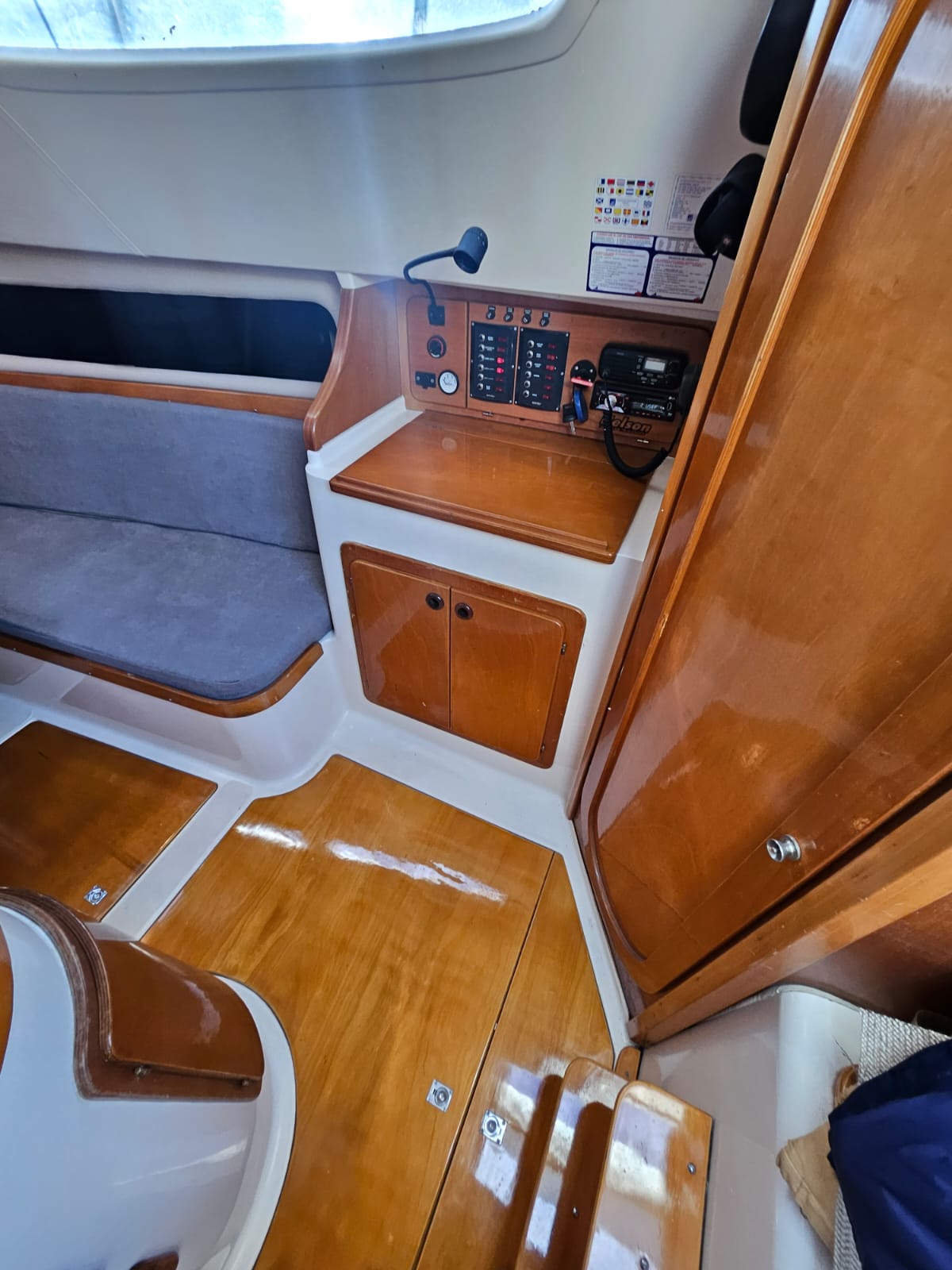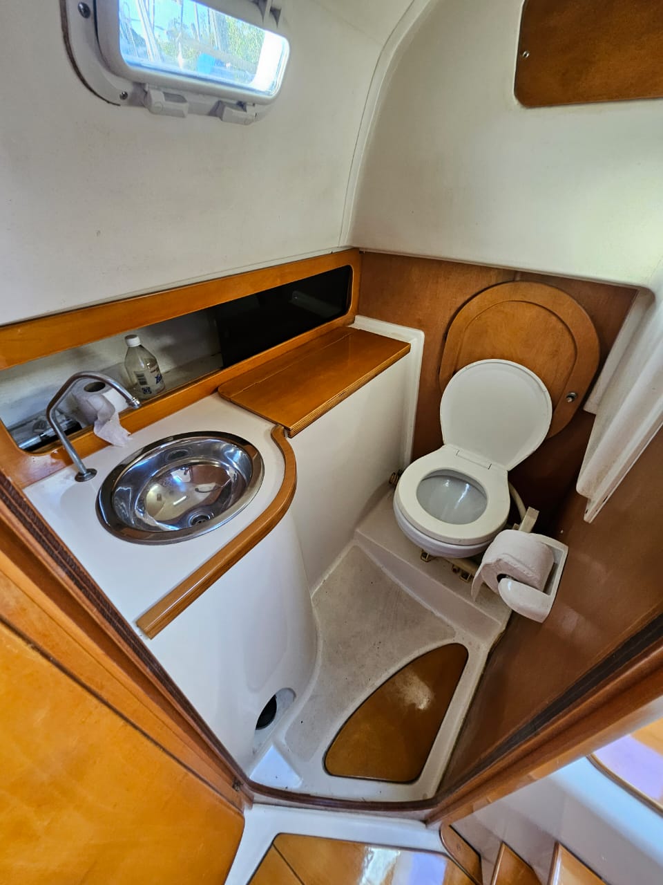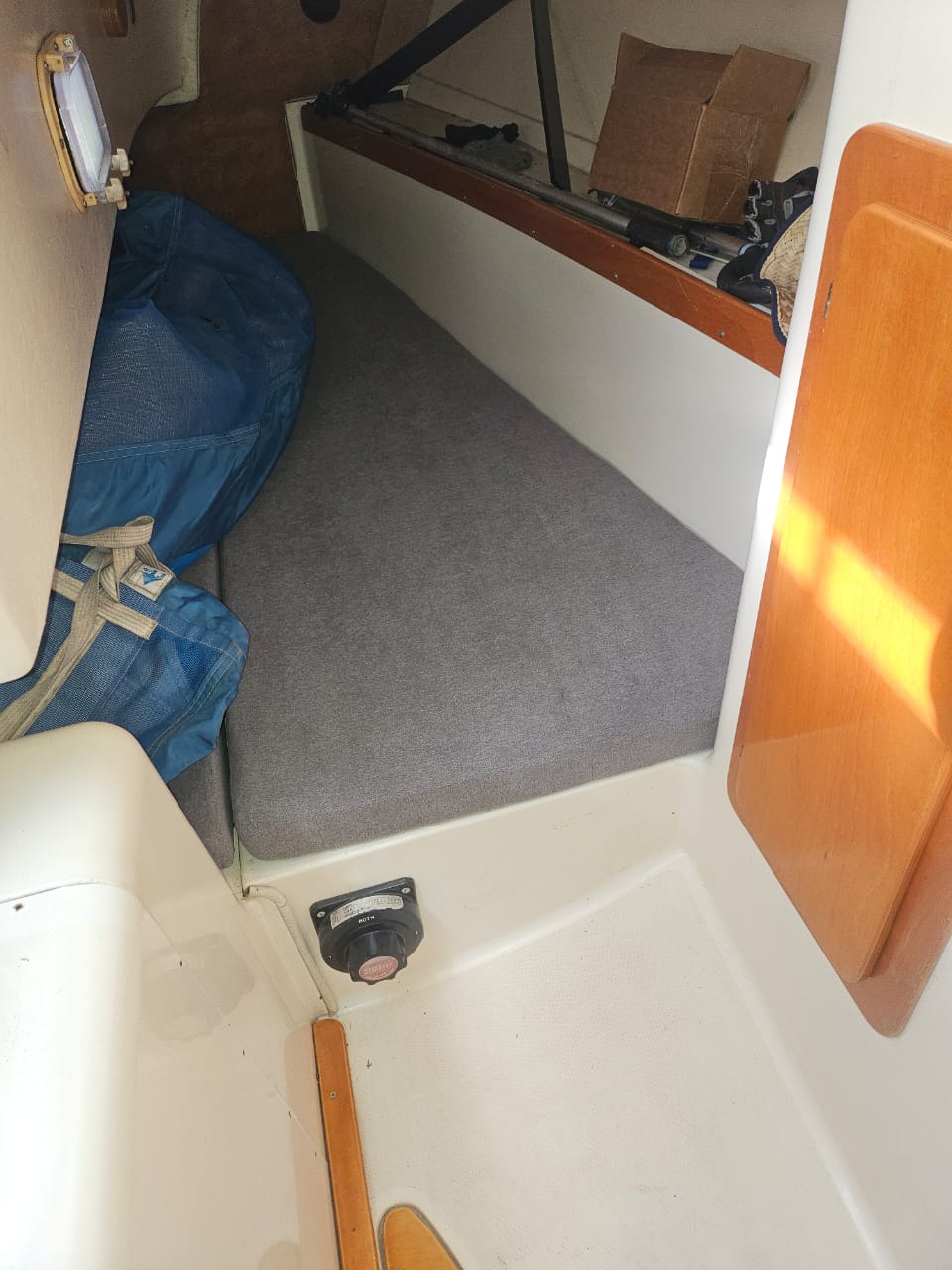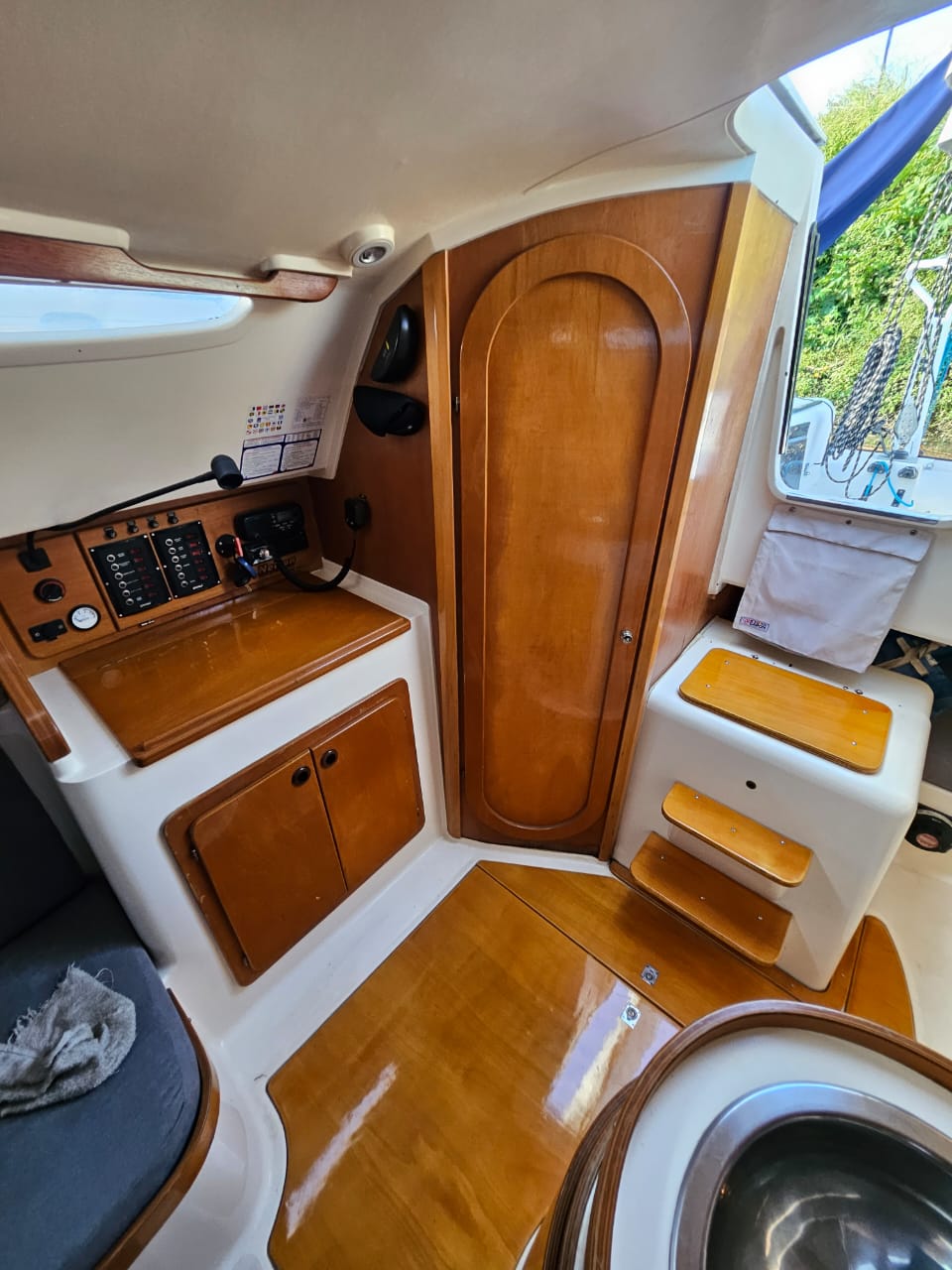 Cama de proa doble, salon con mesa central, mesa de navegacion, sector cocina, conejera, baÑo compartimentado