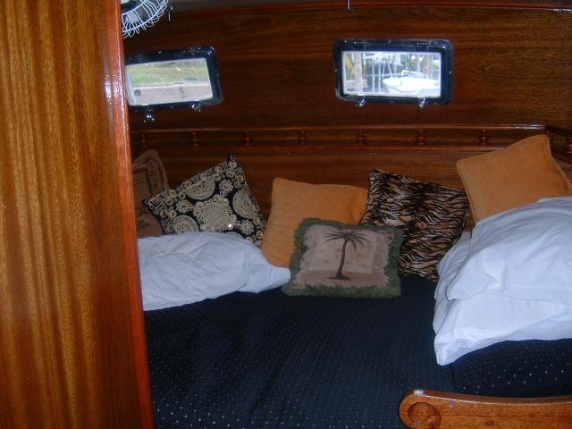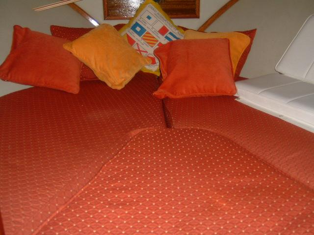 Camarote en proa con baño independiente. Cocina. Salón principal con timonera cubierta. A popa camarote principal con baño independiente.