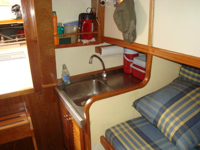 Camarote de proa doble, baño compartimentado, salón con mesa dinette y cucheta, sector cocina.