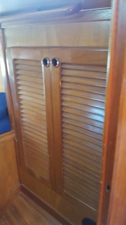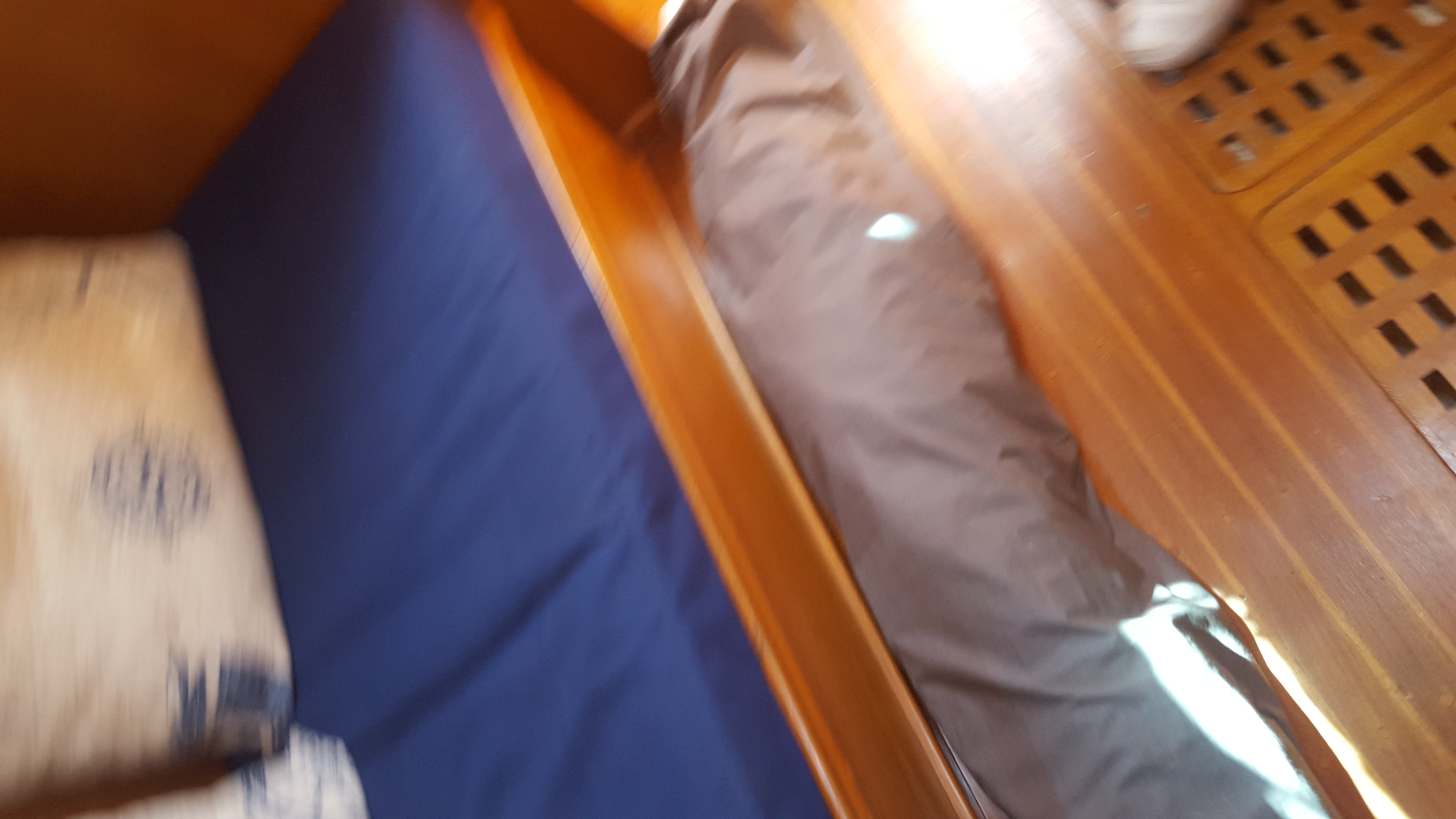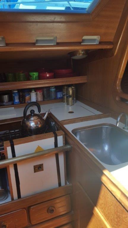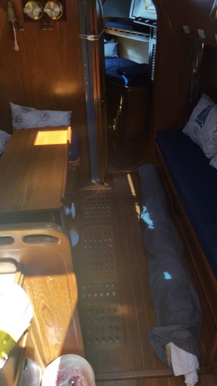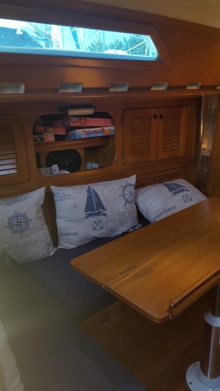 Camarote de proa doble, baño compartimentado, salón con mesa dinette y dos cuchetas, sector cocina, conejera amplia.